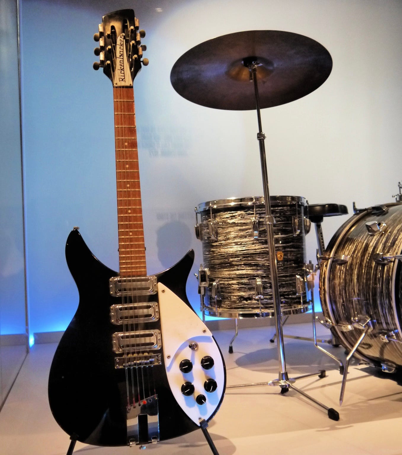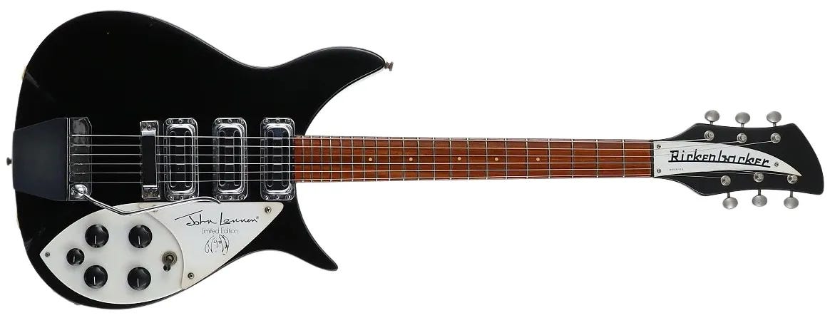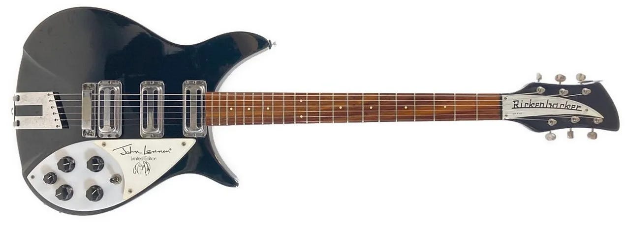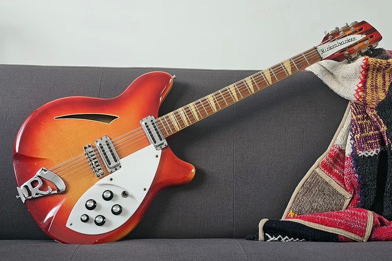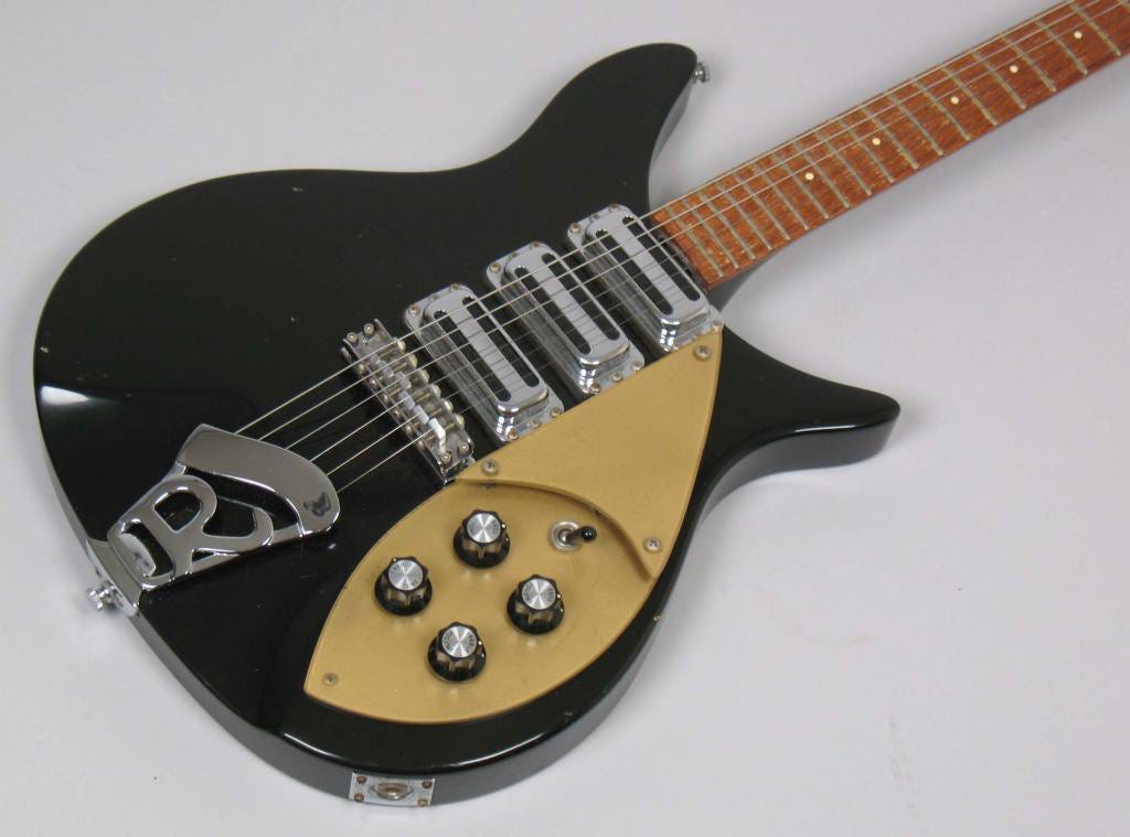 The next Beatle guitar on the list is George Harrison’s 1963 360/12OS, the second (behind the “Suzy Arden” 360/12OS) 12-string guitar ever made by Rickenbacker and the first strung with the octave strings “backwards” in what is now standard Rickenbacker fashion.