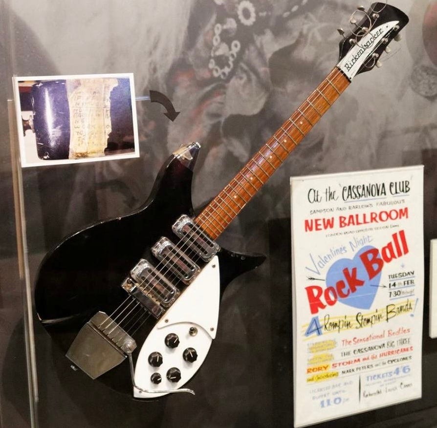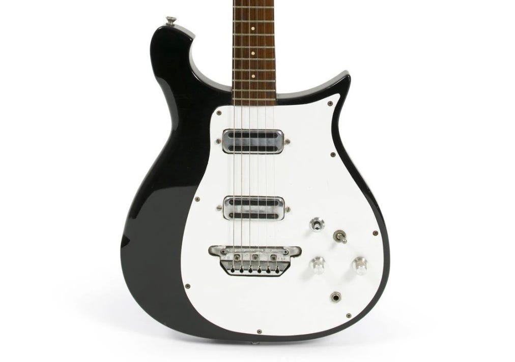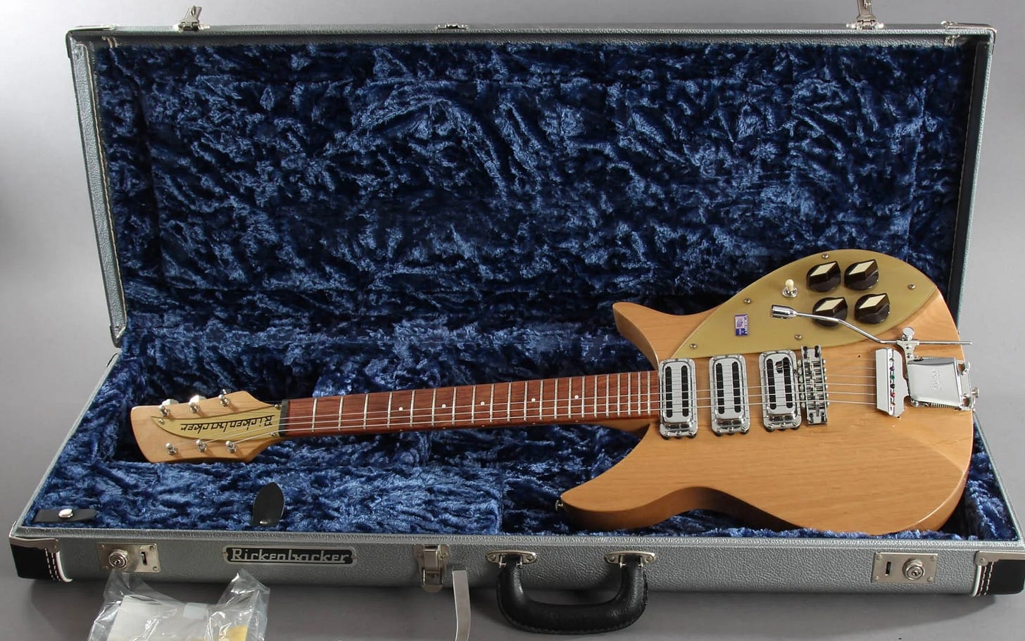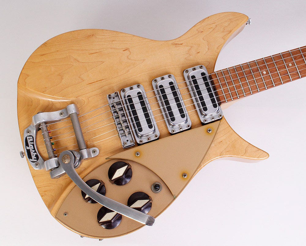 Over the years Lennon tinkered with it multiple times, and by the time it was retired from touring in 1964 it had been refinished black, the knobs had been changed to chrome Burns knobs, the bridge had been replaced with a Sorkin “bowtie” bridge, and the Kauffman had been replaced by a Bigsby B5. The black finish was later stripped back to natural. This is the OG Beatle Rickenbacker.