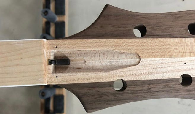 When it is cut from the top, the filler strip is hidden by the fingerboard. Note in the diagram above how “deep” into the neck that channel is at the midpoint—we’ll come back to why that’s important later.