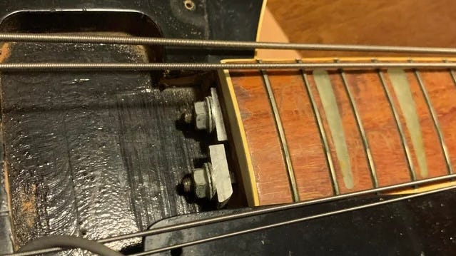 Other key reasons cited include the additional structural strength the extra rod imparts—and given how slim vintage Rickenbacker necks were compared to their single-action rod equipped contemporaries this is probably a pretty legitimate concern—and their ability to correct a twisted neck. Here’s a pretty extreme example of a twisted neck: