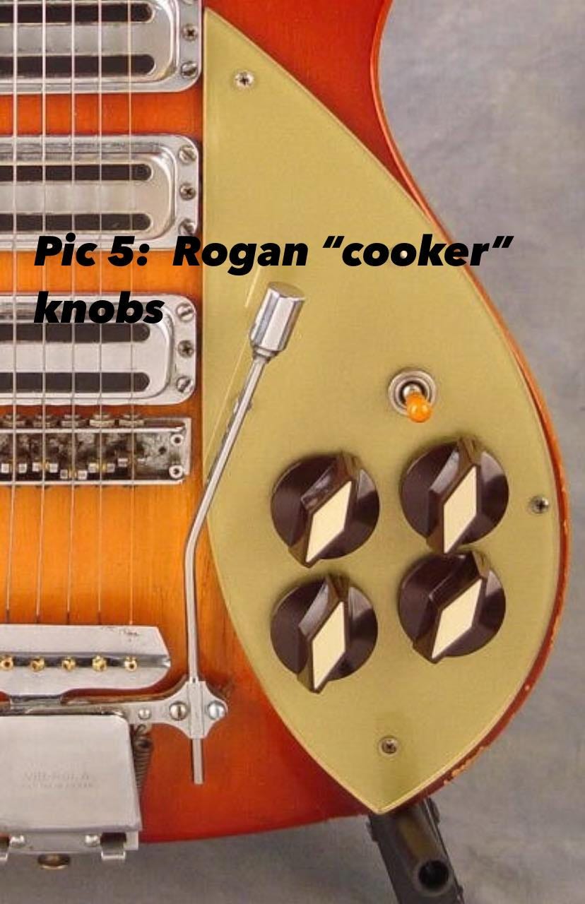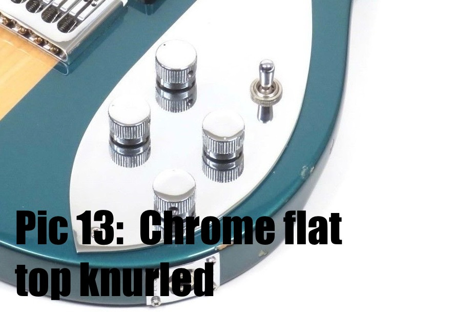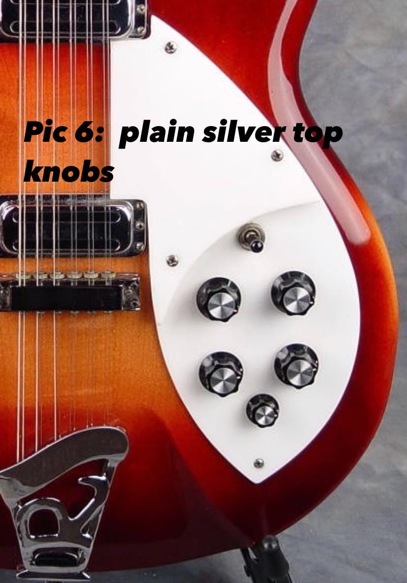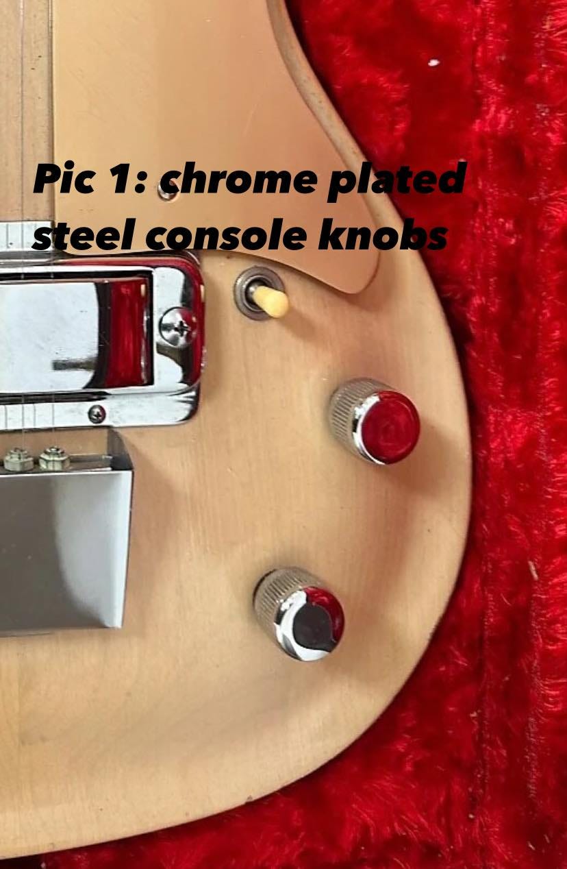 So, on those first “modern” Rickenbacker guitars, the Combo 600 and 800, I can find both current and contemporary examples of three types of knobs used. The far most common are the chromed dome top/ribbed side knobs (labeled Pic #1 below) as found on contemporary console steels.
