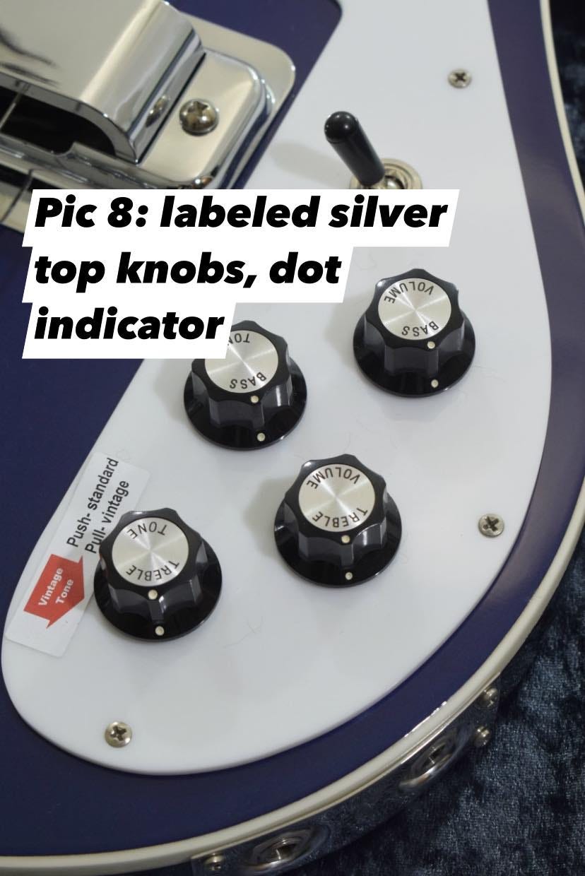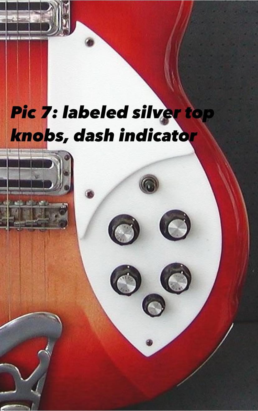 The new round top 360 had brand new knobs: the skirted, fluted side, silver top knobs that would go on to be the primary knob used on most guitars for the next 56 years. But there are a couple of variations on this knob. The very first knobs (Pic #6) had no labels on the top, a white indicator dot on the skirt, and a white indicator dash on the top.