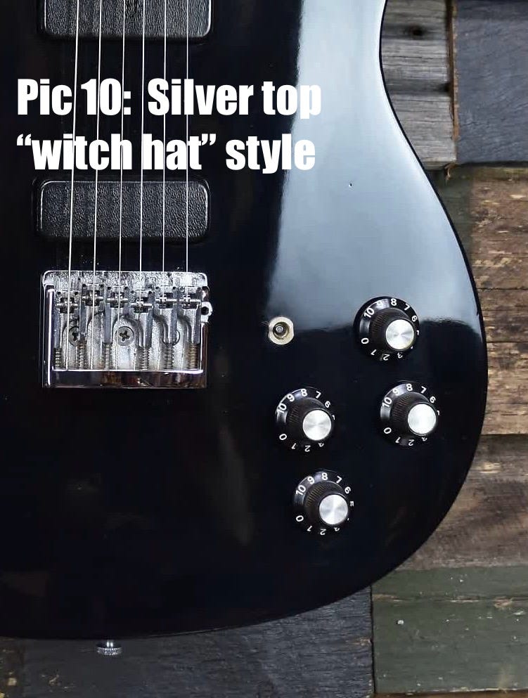 The 200 series guitars and 2000 series basses appeared in 1984 and brought the first “new” knob since the silver tops: unlabeled knobs somewhat similar to the “witch hat” knobs found on Fender amps or Gibson guitars—black with numbers printed on the skirt, but with knurled barrels that were more cylindrical than the conical witch hat knob. These came with a gold (for the 250 and 2050) or silver (for the 230 and 2030) top (Pic #9 and #10).