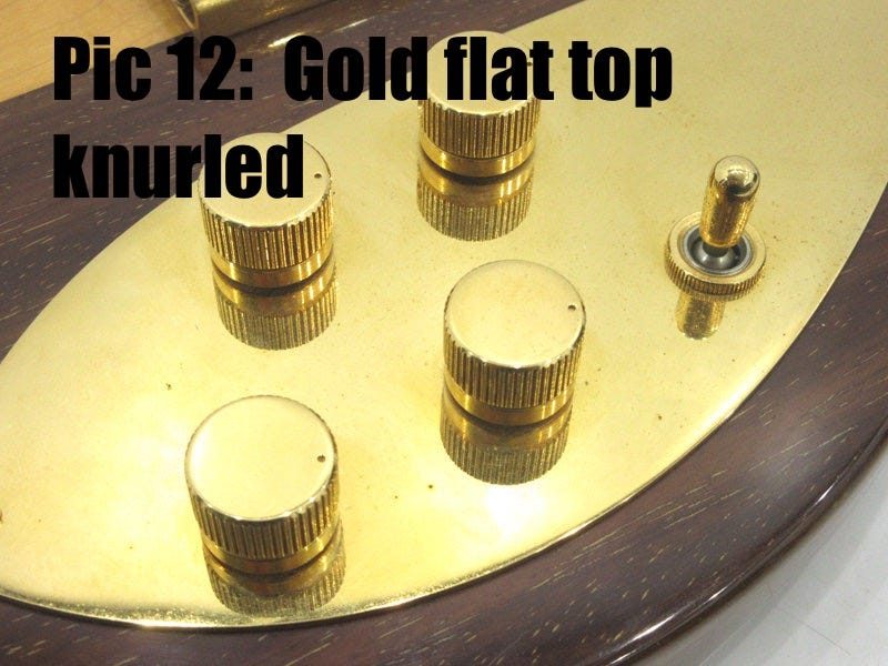 The next new knob would appear in 1992 with the introduction of the 650 series of guitars and the 4004 bass. The “Standard” 650 Atlantis/Colorado/Dakota and 4004 Laredo received flat topped chrome knobs with knurled edges and an indented indicator dot on top (Pic #12), and the “Deluxe” 650 Sierra/Excalibur/Frisco and 4004 Cheyenne got similar knobs in gold (Pic #13).