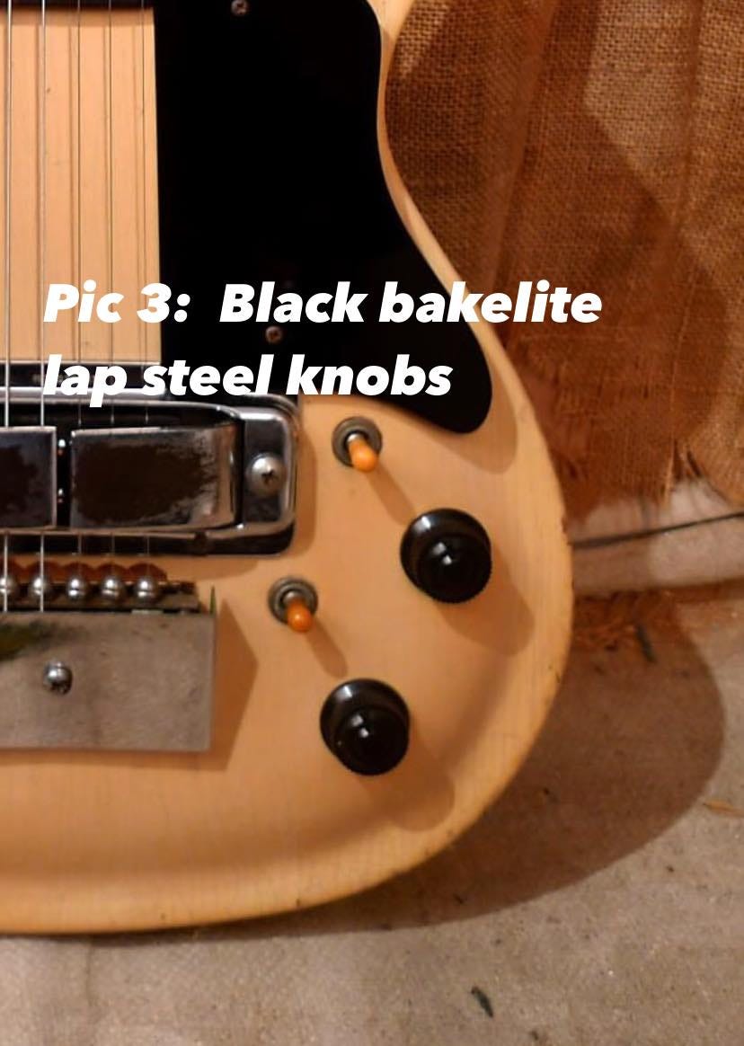 These knobs appear to be the same type as fitted to lap steels of the period—which makes sense—but it is very hard to tell exactly what types they are in period photos and there are multiple types found in current photos. The one pictured is the most common, so I’m going to go with that. Note that knob types 2 (clear lucite) and 3 (bakelite lap steel) ONLY appear on combo 600 and 800’s.