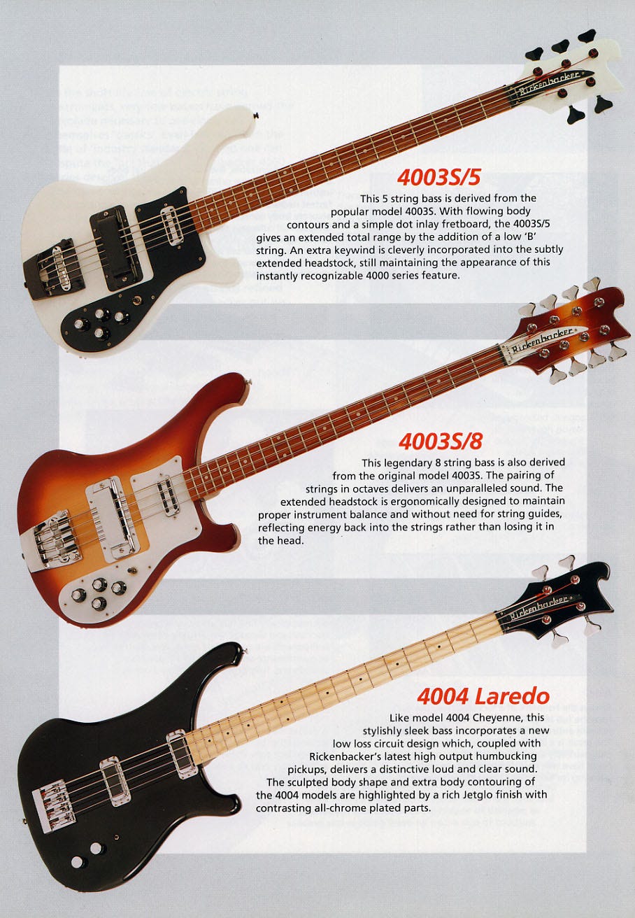 Now I try to be as conclusive and factually correct as I can possibly be. But this one…I can’t be conclusive. I have opinions, but I’m not certain. I am certain that upon launch in 1986 the 4003S/8 left the factory strung in “normal, octave strings first” fashion—although plenty have since been changed to “Rickenbacker, octave strings last”. I BELIEVE that around mid 1993 that changed to a default setting of “Rickenbacker, octave strings last”. That’s certainly how promotional material showed it, and how most guitars appear today. But because so many of these guitars have had their string order changed over the years, I just can’t say for sure.