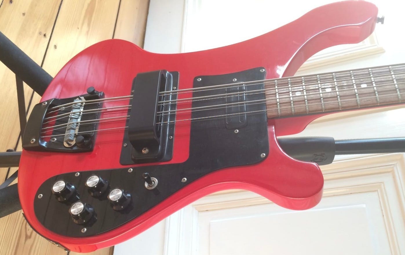 The 4008 first appeared on the 1982 price list—and most of examples I’ve seen date to 1982 and 1983. It stayed on the price list but moved to the “custom order list” in 1984. When John Hall bought the company in 1984 he pretty ruthlessly trimmed the catalog down—and the fact that he retained the 4008 on the 1985 price list means that he planned on a future for an 8-string Rickenbacker. It just wouldn’t be the 4008.