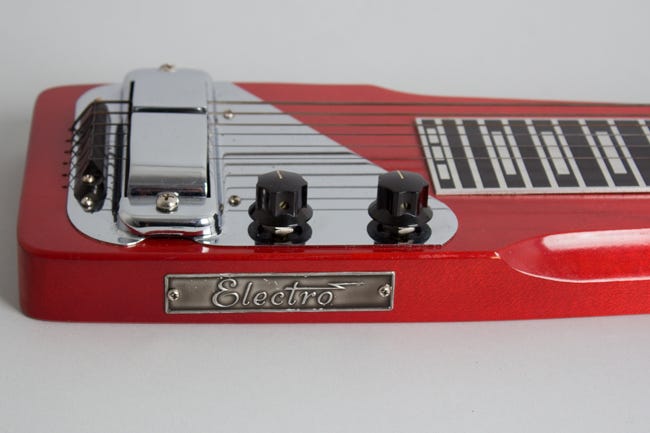 So we find ourselves in 1935 with two logos, two spellings of the name on that logo, and marketing material that used whatever combination of “Rickenbacker” and “Electro” the copywriter felt like that day. Did it get better? Not during the pre-war years, no. Apart from a three color decal replacing the metal logo plate on the Model 59 lap steel in 1939, things stayed pretty much as is.
