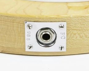 The model 3000 bass (click to learn more) introduced in 1975 had a similar problem. It had neither a side jack plate—its output jack was mounted on the front—or a bridgeplate, as it used a standard Rickenbacker bass bridge. So what to do?