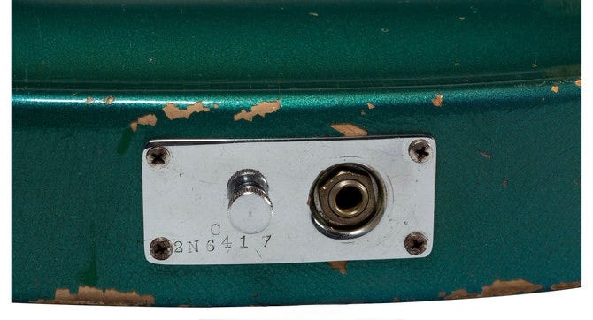 Also in 1965, the 425 gained a Japanese vibrato unit (click to learn more) that lasted until 1967. As this guitar had neither a jack plate or a bridgeplate, the serial number was stamped onto the vibrato unit.