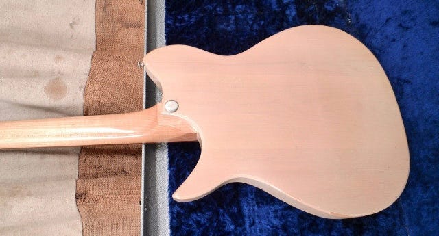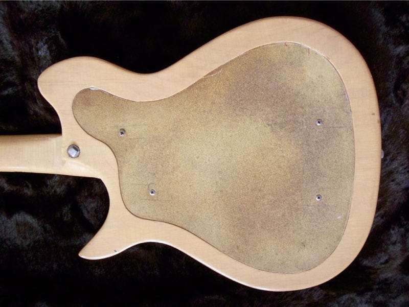 Rather than routing out the beefy two-and-a-half-inch-thick body from the top, Rossmeisl routed it out from the back. And instead of gluing a wooden back in place, the routed out area was covered by a thin metal sheet—sometimes bare metal, sometimes flocked—held on by four wood screws.