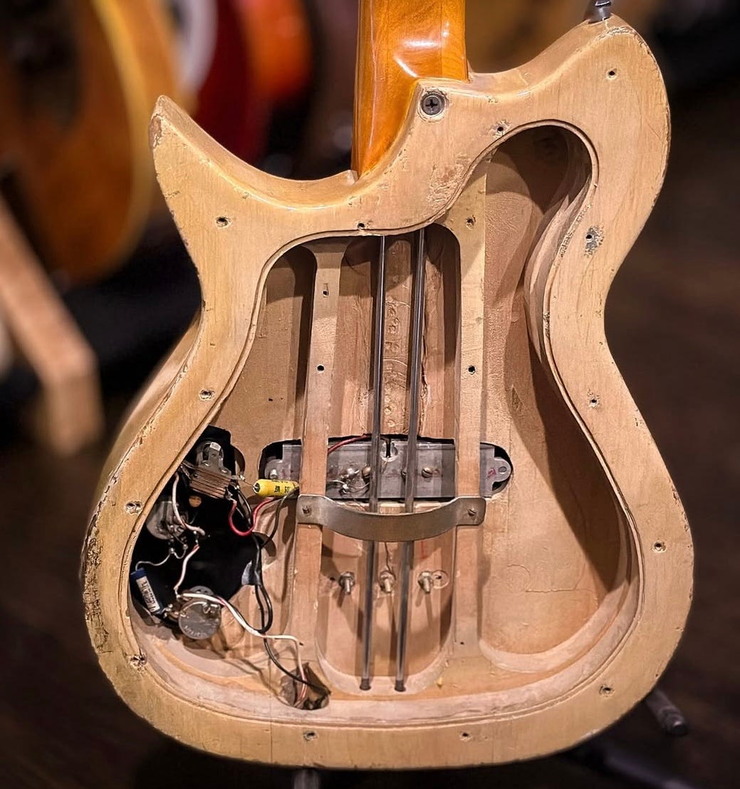 The root cause that led to the constant modification of the bridge and ashtray assembly was a poor neck set. Look at just how close the fingerboard height is to the guitar’s top on this 1954 Combo 600: