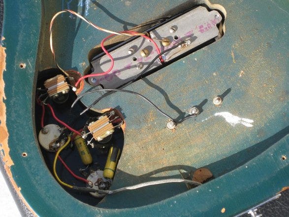 The wiring harness featured a volume control, a tone control, and a three position tone selector. The exact function—and specifications—of that selector however, are difficult to pin down.