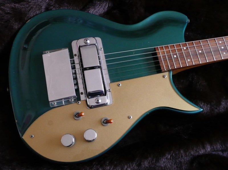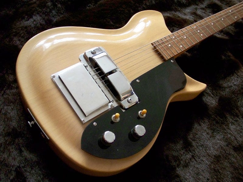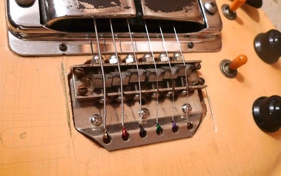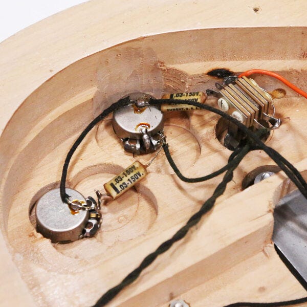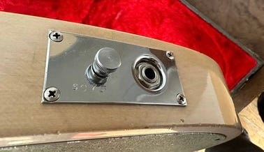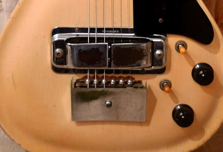 The problem is that nearly every photograph I can find of the Combo 600’s wiring harness shows something slightly different, and almost all examples appear to have been modified at some point in their lives. My best guess is that one position engaged a high pass filter for a brighter tone, one engaged a low pass filter for a darker tone, and the last allowed the signal to pass unfiltered to the volume and tone controls. The output jack was located at the butt of the guitar, on a plate shared with the strap button.