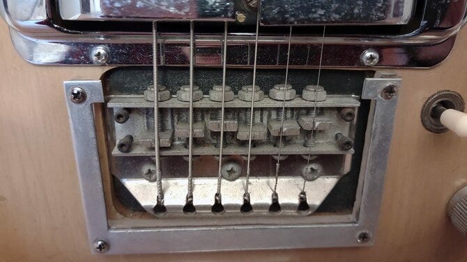 Returning to the second photo, the purpose of the thumbscrew in the middle of the ashtray cover is now clear—to allow the ashtray cover to be bolted directly to the bridgeplate. This is workaround number one for a bad neck set.