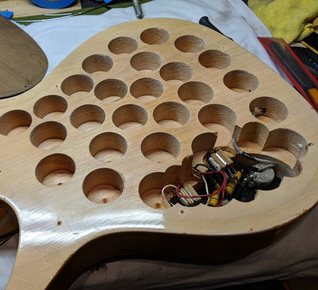 With the electronics easily accessible from the front of the guitar, the internal routing now served more as weight relief and evolved as time passed. At first, the rout pattern changed to much more aggressive, to maximize weight relief.