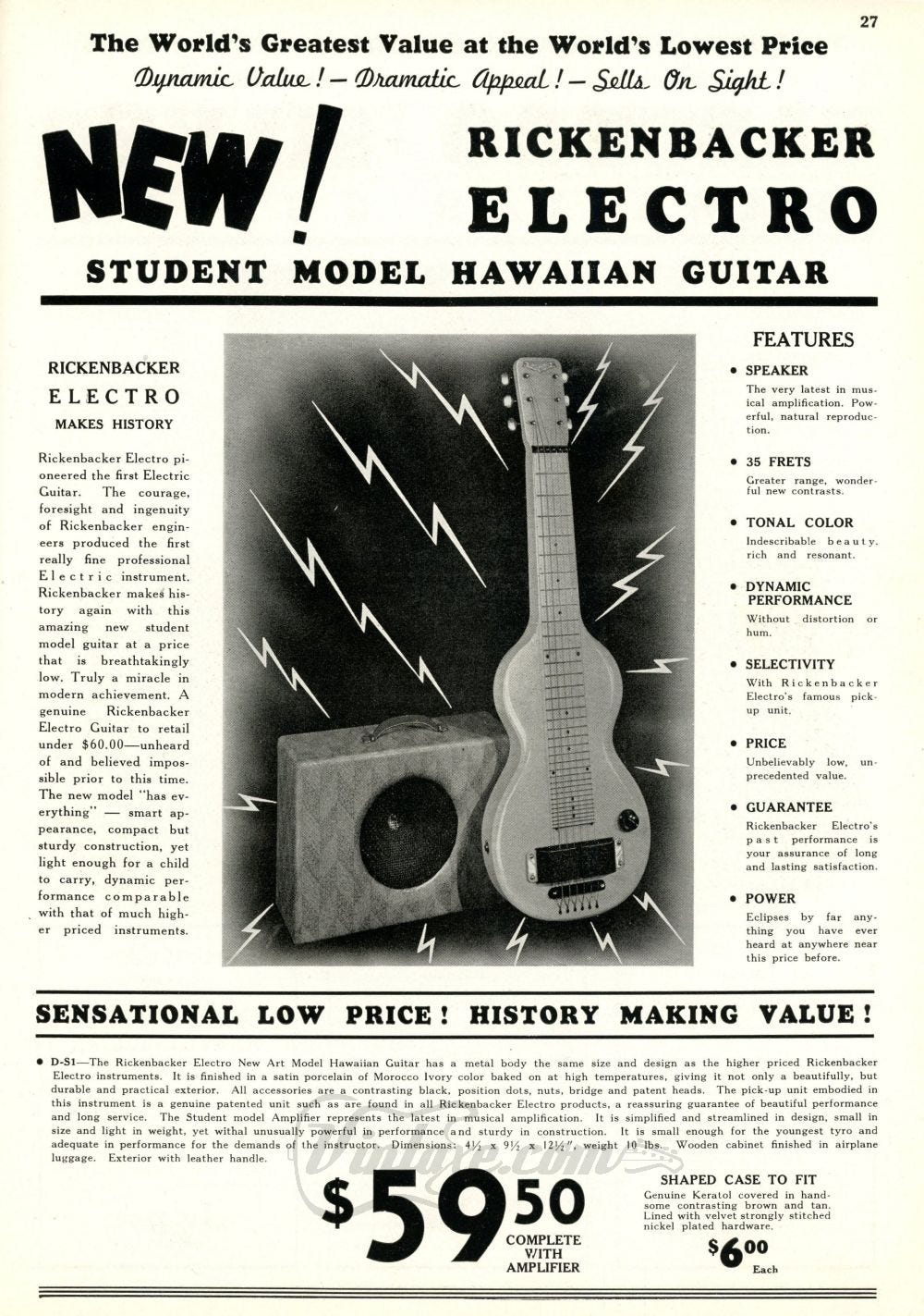 Introduced in 1936, The Model 59 was the entry level “Rickenbacher Electro” lap steel (click here to learn about Rickenbacker’s famously inconsistent early branding), joining the aging “frying pan” A-Series and the Bakelite B-Series guitars in the lineup. Its decidedly “modern” stamped steel body was a defining characteristic—central to both its construction and its sound.