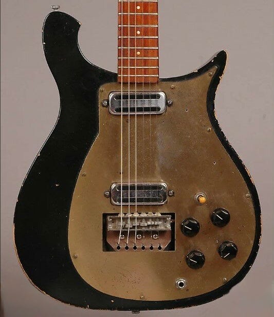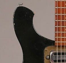 The first Combo 450s looked just like that, but with two pickups. Later that year, however, Roger Rossmeisl revised the design. As you can see, the tulip’s concave cutaways made upper fret access difficult. Whether in response to player feedback or just common sense, he trimmed the lower cutaway significantly, removing half of the “tulip”. And thus the half-tulip was born.