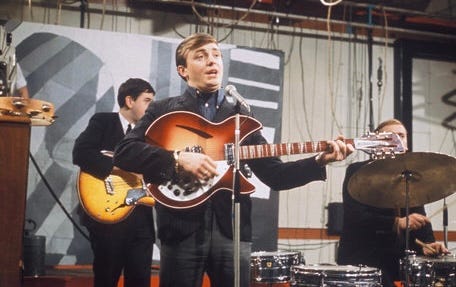 The factory designation for the guitar was 360S/12—“S” for “Special”. So what was it, exactly? Well, Marsden’s guitar was identical to Harrison’s apart from the new-for-1964 crushed pearl triangle inlays, and the 360S/12 was identical to Marsden’s…apart from having a Rose Morris-style f-hole. Thus the “Special”. I’d love to show you a good picture of that guitar today, but…