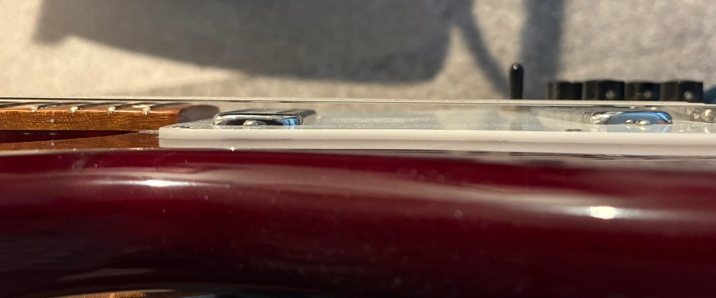 Now we can see why there’s a shim under the bridgeplate AND why the bridge is just about maxed out height-wise—it wouldn’t work without it. The bridge would be too low because it was designed for a 3/8” deck height, not a 3/4”.