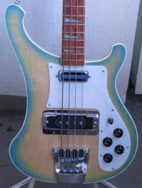 So this is how the story goes: in 2007 Chris Squire called up Rickenbacker and asked for six unfinished/unassembled 4003 husks to be painted by British painter Paul Karslake, who had painted Squire’s custom “Fish Out of Water” bass. At least three of those basses were painted by Karslake, with pastel “perimeter bursts”. That’s the story. Here’s what we can validate.