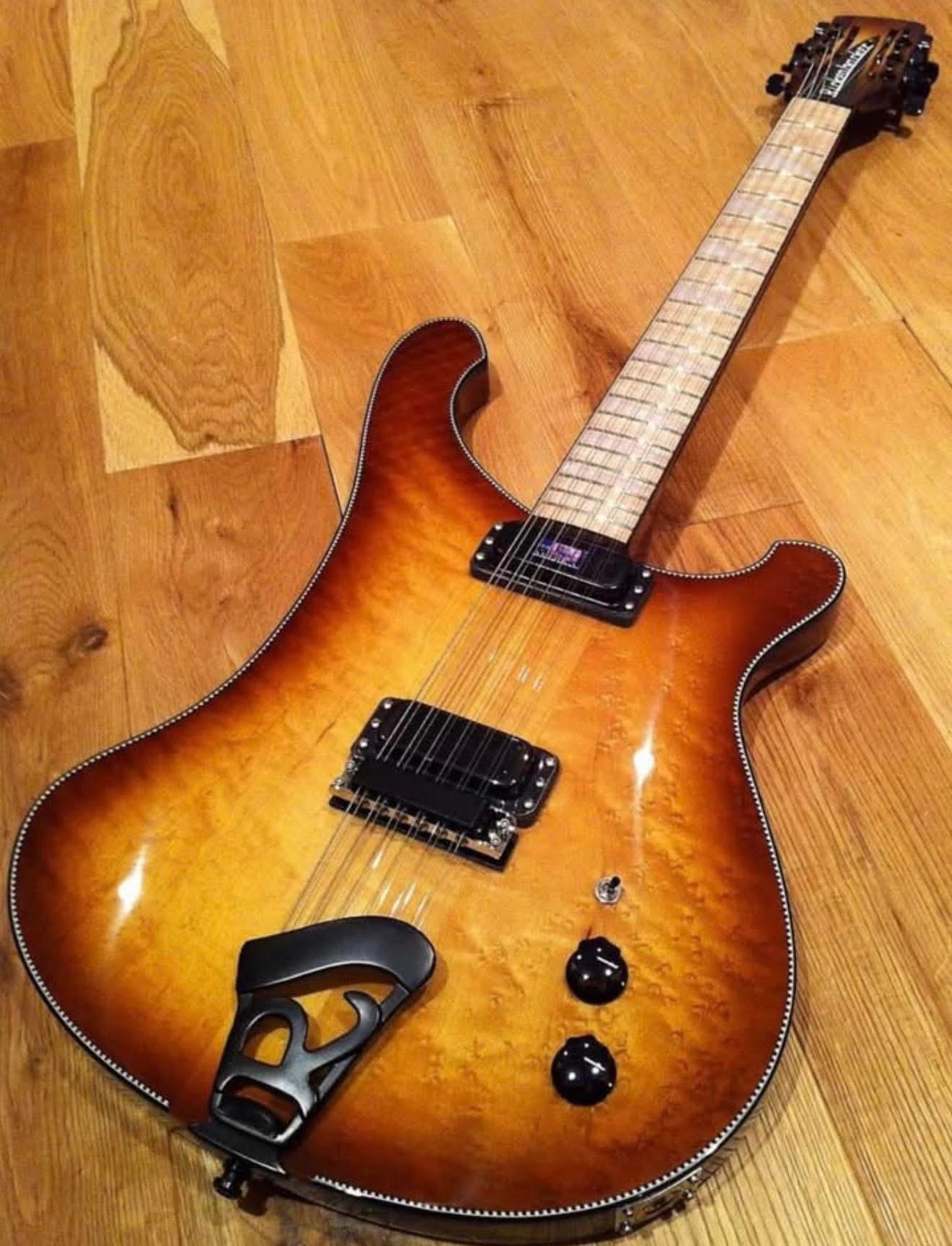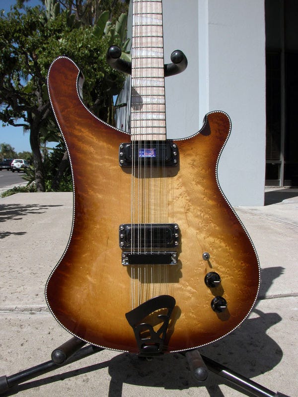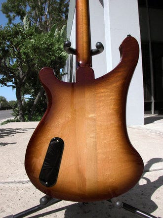 We already know it used the leftover 4002 wings, with their figured maple and two-ply black and checkered binding. To this, they added the 660’s wider neck, a black-bound maple fingerboard with triangle inlays, toaster pickups, and blacked-out hardware and plastics. And six extra strings.
