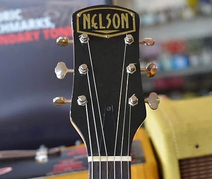 So what’s the story here? Well, as best as I can put it together Nelson Guitars was a one man shop run by Minnesota luthier Bobby Nelson from about 2011-2019. He began with acoustic guitars, but seems to have added the Rickenbacker-based Coquette solidbody to the line around 2012. Here’s how dedicated he was to getting it “right”: given that the obscure DeArmond pickups the Combo 400 originally wore hadn’t been available in 50+ years or ever copied, he built his own cosmetic replicas!