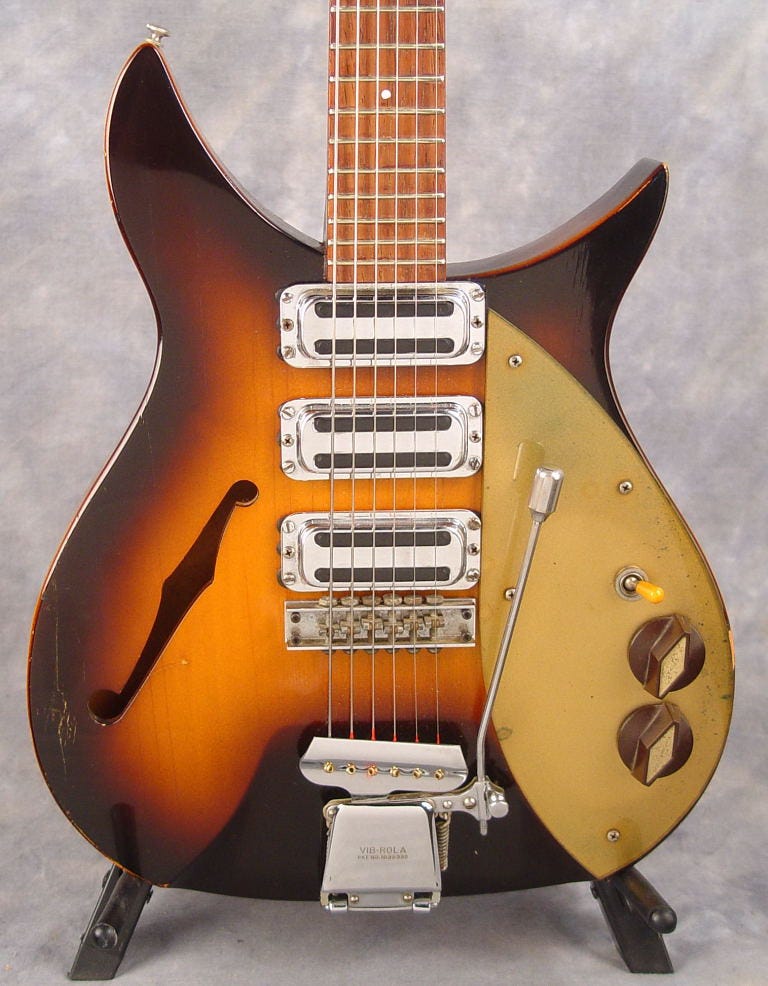 So what do I mean by missing link? Well, let’s talk about the guitars it’s linking. We’ll start with Rickenbacker’s first modern electric guitars, launched in 1954: the Combo 600 and 800.