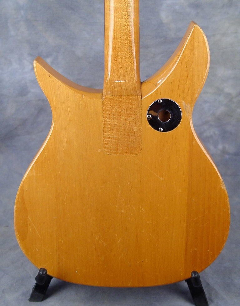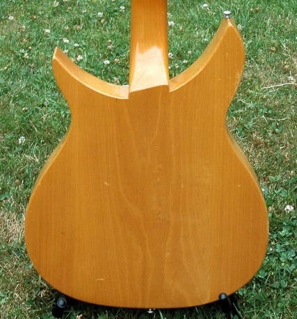 Despite sharing a silhouette, the short scale Capris had a number of differences from the 850. As already noted, they featured a short scale of 20.75” as compared to the normal 24.75”. But the body was quite different as well. Obviously they lost the German carve top. But in addition to that they were true semi-hollowbodies—the three-piece body was carved from the rear with a one-piece plywood back glued on to help hold the set neck in place. The same basic construction technique has been used on pretty much every Rickenbacker semi-hollowbody since.