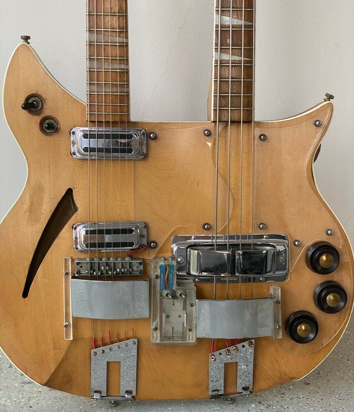 So that’s what Blackwell got from the factory. The rest was up to him. As far as controls go, there are three stacked-pot knobs—volume/tone for each pickup—and two toggle switches on the upper bout. One of those selects pickups on the guitar neck, and the other selects the neck. The guitar does feature a Rick-O-Sound output jack, but it is unclear how it is actually wired. The knobs are top-mounted through a custom plexiglass pickguard, and both necks have raised (by way of a grommet) plexiglass pickguards in the playing area.