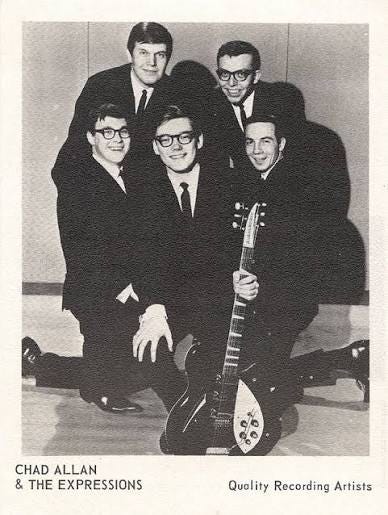 In 1965 Chad Allen and the Expressions would release a single as the Guess Who? in an attempt by their label to imply that the record was secretly recorded by a British Invasion band incognito. Which band? Guess who? The name stuck and the Guess Who (without Allen, who left to return to college) would go on to score 14 Top Forty hits in the U.S. and over 30 in Canada.