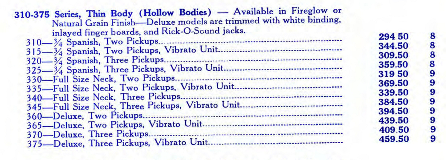 The second is that it wasn’t a copy of George’s guitar he ordered—he ordered a copy of John’s, but with the same finish as George’s Gretsch. Let’s examine the evidence. This is the price list Lowe’s likely would have had when Bachman placed his order: