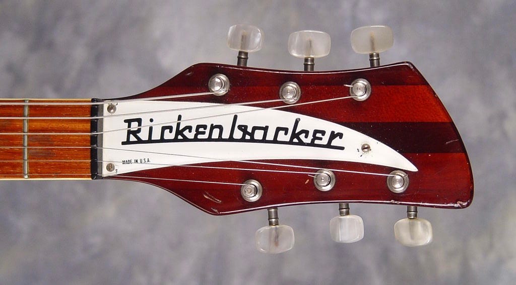 So let’s talk about what we do know for a fact. Bachman did custom-order a Rickenbacker with a “natural walnut” finish from Lowe’s in 1964—which matches Harrison’s Gretsch Country Gentleman’s finish. And this guitar, produced in October 1964, is what he received several months later:
