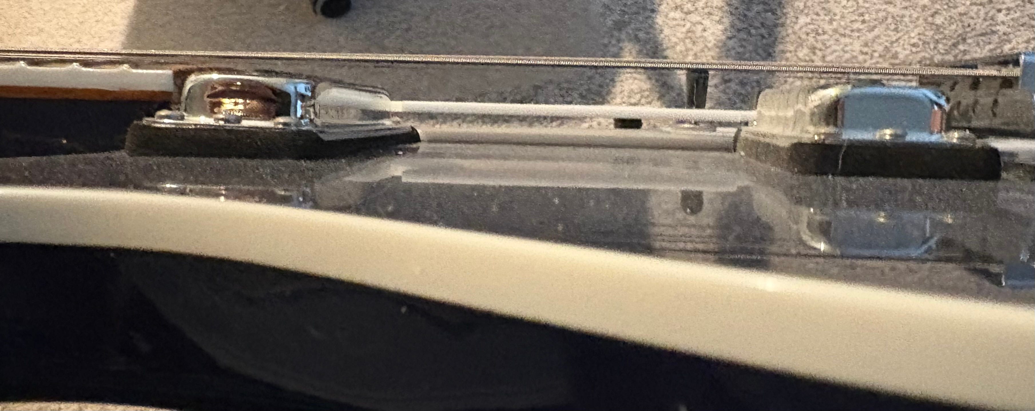Now we can see why there’s a shim under the bridgeplate AND why the bridge is just about maxed out height-wise—it wouldn’t work without it. The bridge would be too low because it was designed for a 3/8” deck height, not a 3/4”.