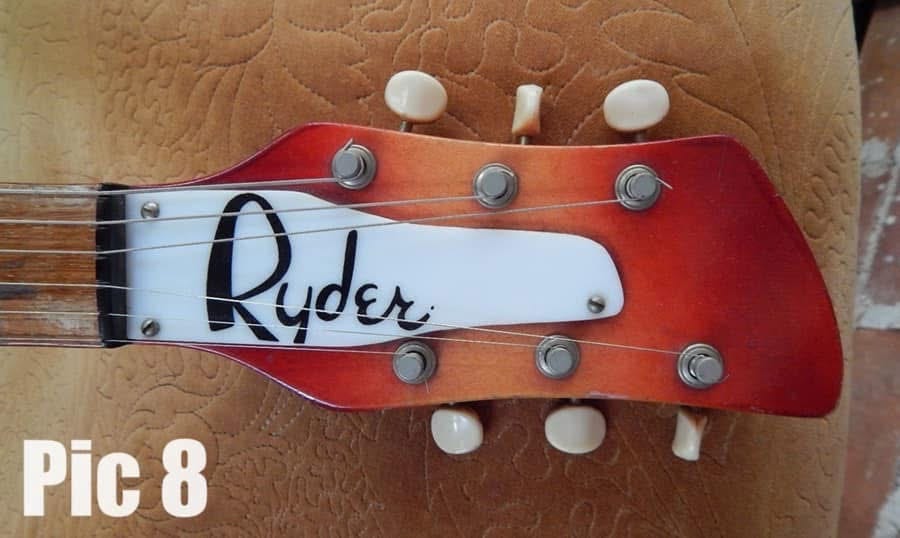 Ryders were made between 1963 and 1966 for the Ryder Music School. They used the Perspex blob shape we saw above on the second Electro truss rod cover—although it evolved some over time—but had a stylized Ryder logo silk screened in black on top (Pic 8 ).