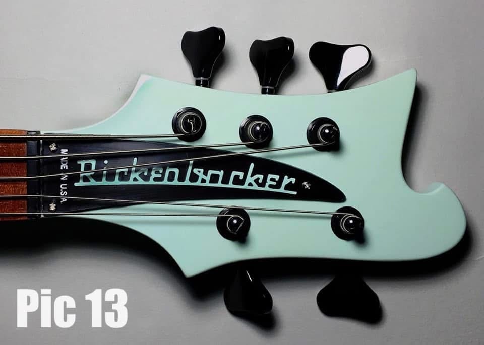 A white raised letter injection molded truss rod cover with Mint Green logo and perpendicular MADE IN U.S.A. appeared on a one-off 2016 4001C64/5 in Mint Green (pic 13).