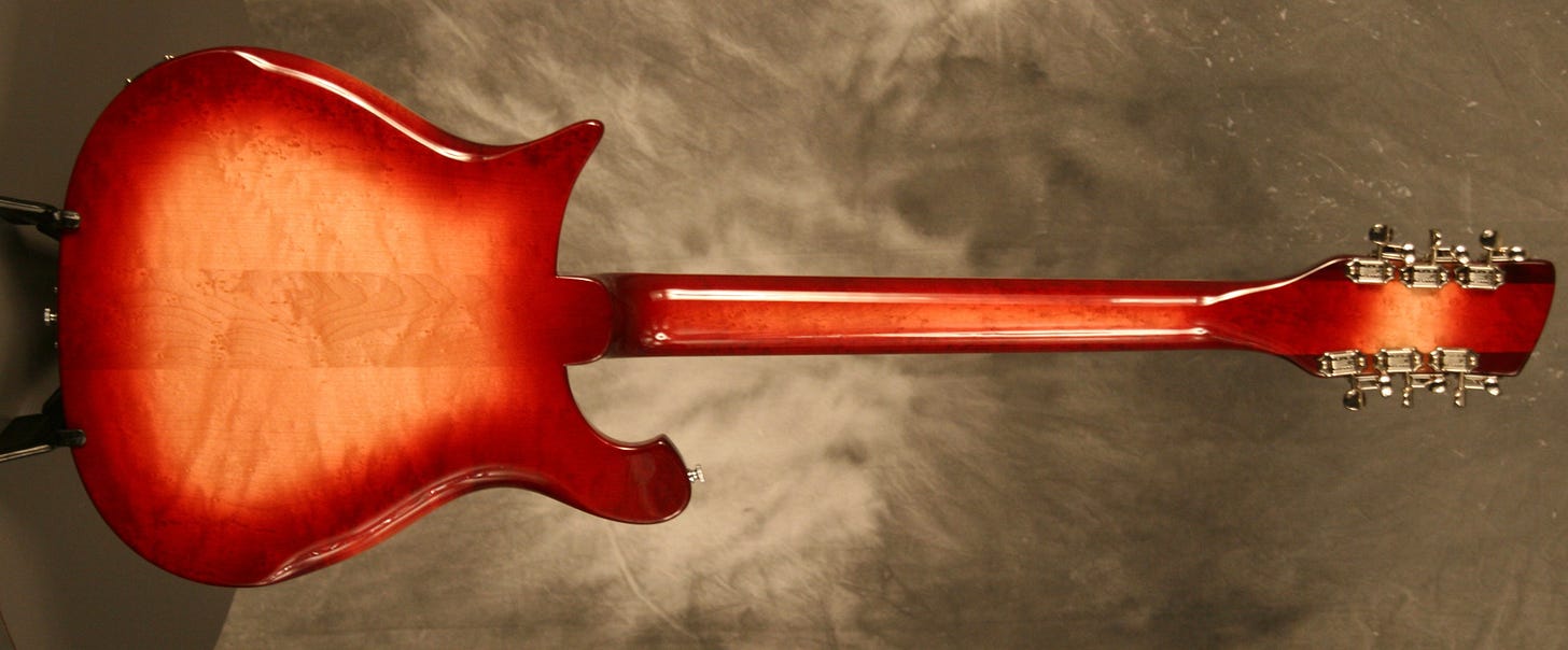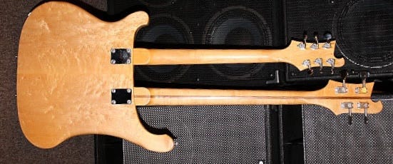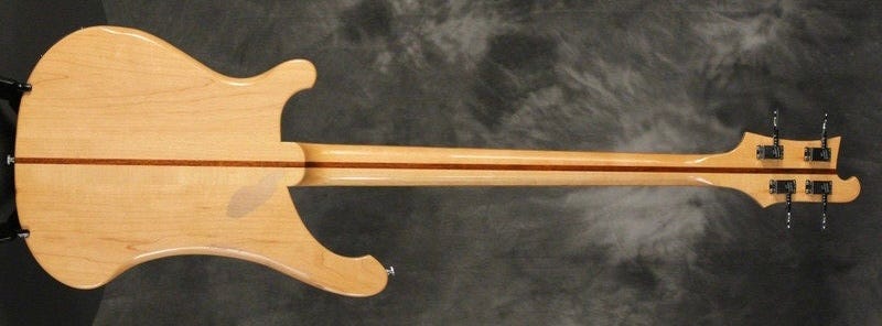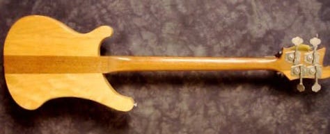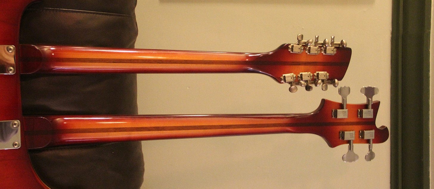 Are we done? No. There’s one oddity I left out that we need to cover before we’re done. The 4080. “The double-necked 4080 had necks that were both set and bolted on. The bass neck was the same three piece skunk stripe with maple headstock wings found on the period 4001. On six string versions, the one piece maple with maple headstock wings guitar neck found on the 480 was used.”