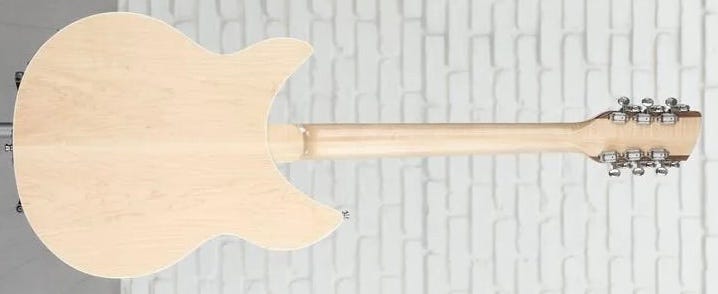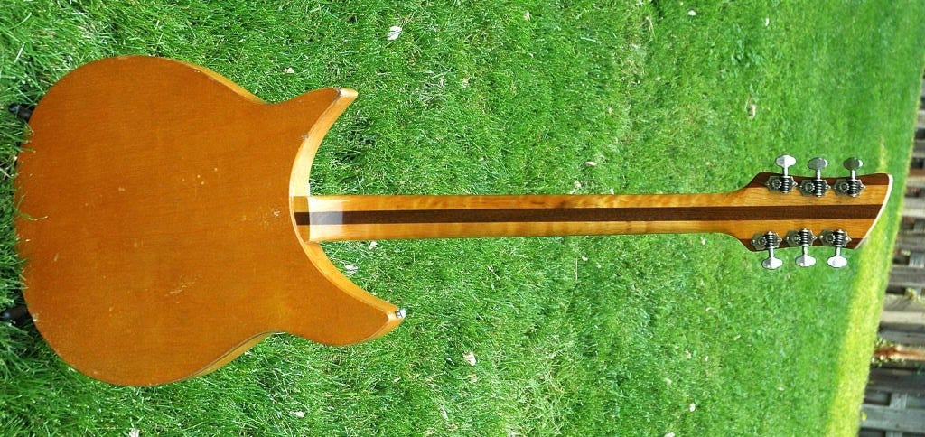 “On 12 string versions the three piece neck with narrow center stripe as found on period semi-hollowbodied guitars was used”.