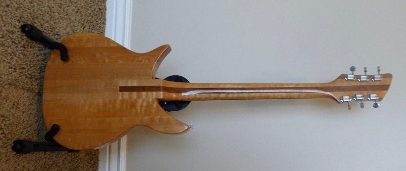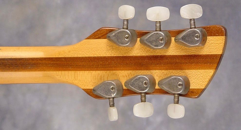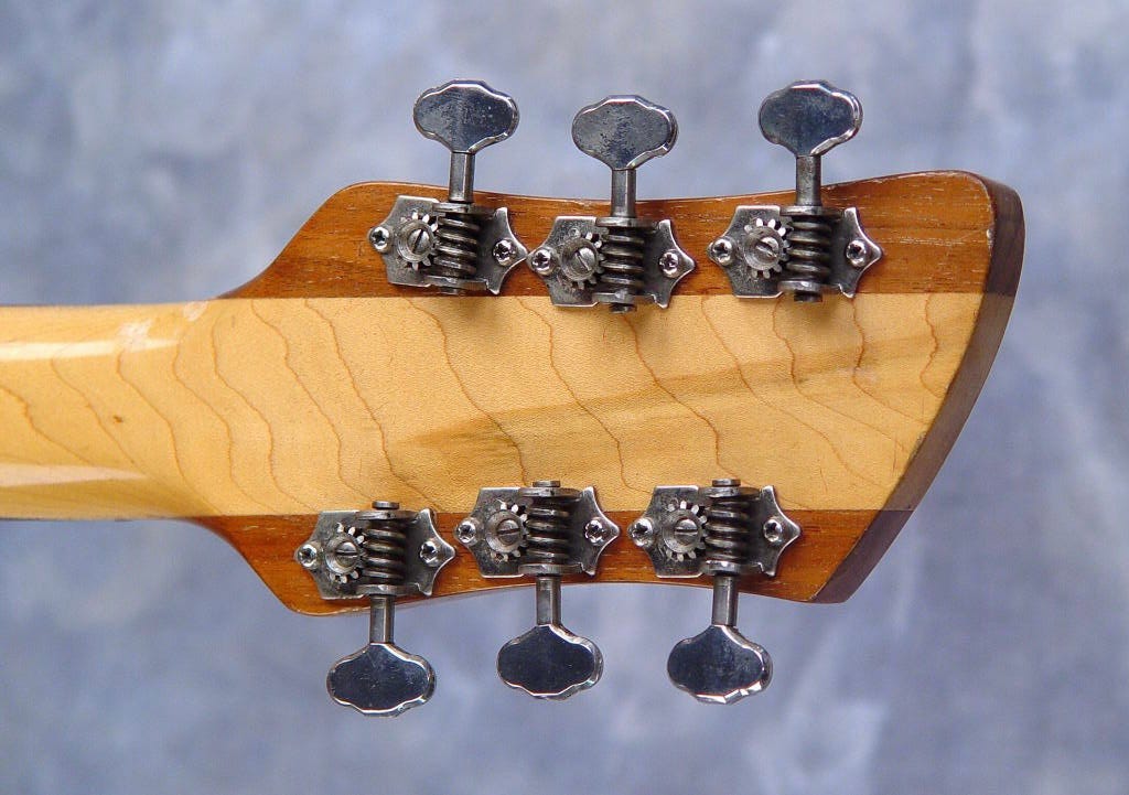 “This would remain the solidbody 4000 series standard until 1972 when construction changed to three piece, with a narrow shedua strip often referred to as a “skunk stripe” sandwiched between two maple pieces and maple headstock wings.”