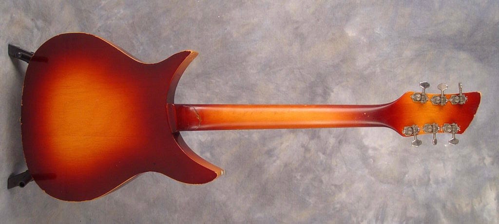 All this is a long way of saying that while these are indeed technically semi-hollowbodies, I’M gonna call them “weight relieved solidbodies” for the purpose of this statement right here: “With the introduction of the Combo 600 and 800 in 1954, Rickenbacker began the practice of using one piece maple necks on solidbody guitars—a practice that continues to this day.”