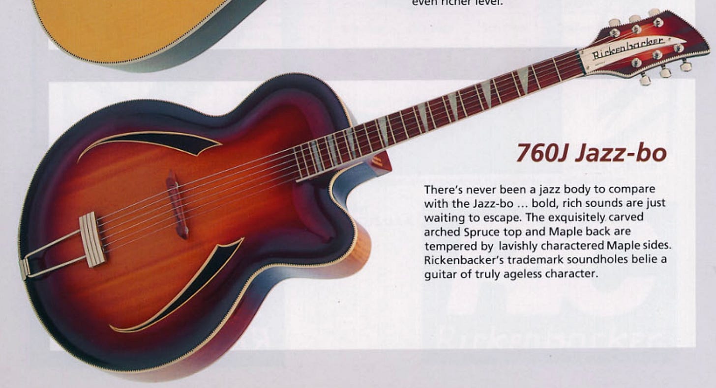 The point it it’s hard to know what’s factory versus what’s aftermarket. And even more importantly, up to this point we’ve been talking solely about Rickenbacker’s “intent”. So even though I can show you plenty of other one-off guitars with bound headstocks, most of those I know for a fact the binding was a specific customer’s request (like the white and purple burst 350s I know someone will bring up). So I’m gonna finish with one more where I KNOW for a fact it was Rickenbacker’s intent to equip the guitar with a bound headstock. We’re talking about the Jazz-bo.