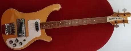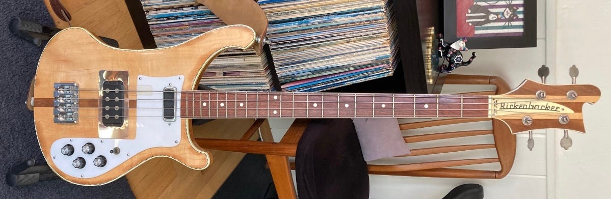 There were a number of “Glueglo era” (1971-72) 4001s (I’ve seen at least three) with weird necks—a wide center skunk stripe like you’d find on a 4005 and dot inlays. At least one of them is fretless—with a finished maple board to boot!—but the one thing they all have in common is a bound headstock.