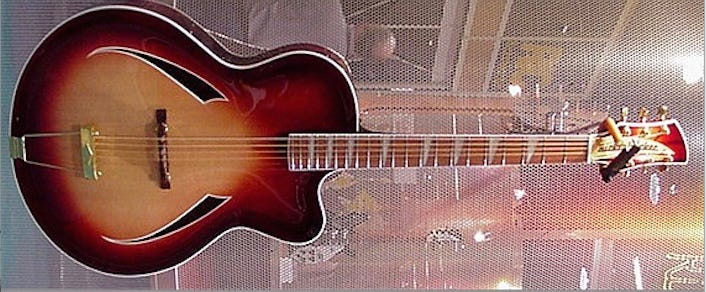 You’ll note that I call this picture a rendering, and that’s because it is. If you look closely, you will see it is the 1958 390 with a picture of a modern neck photoshopped on. That’s because it’s from a 1995 catalog and the Jazz-bo was vaporware at that point. But a real guitar was shown at the 2001 NAMM show, and here it is.