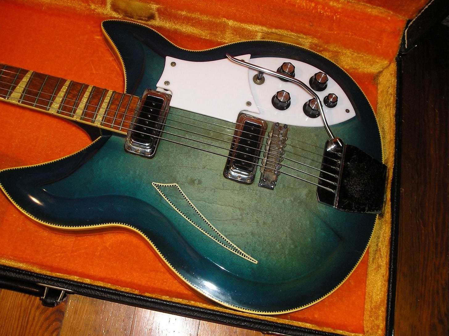 Just simple white binding this time, it still gave the 360 an elegant look. And when the 360 headstock transitioned to the “Gumby” headstock in September, 1971, the binding came with it.