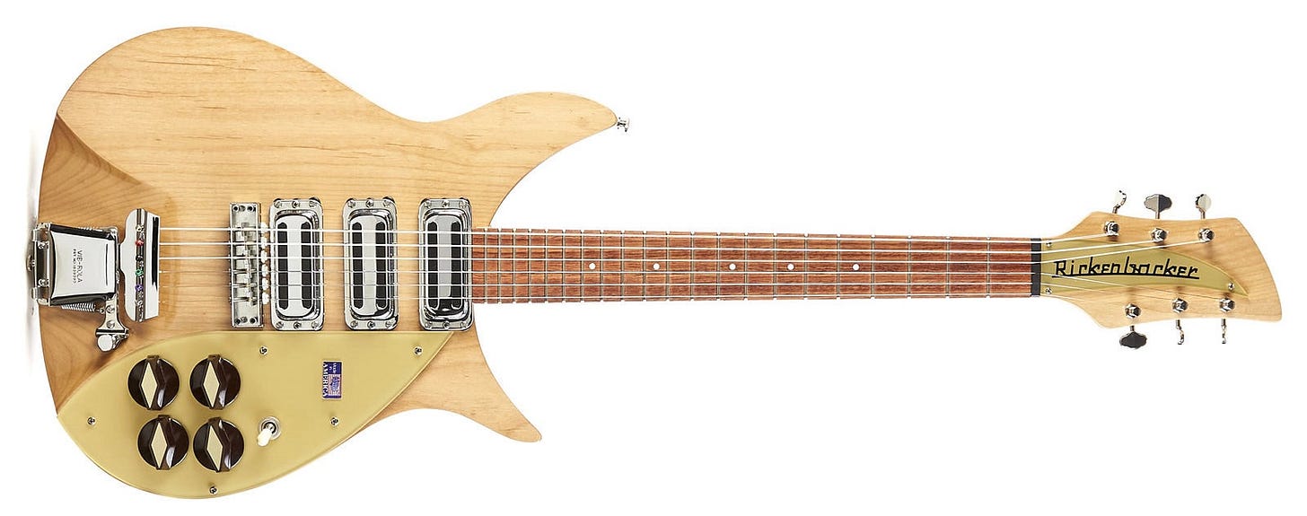 The guitar above started life as 325C58 like we saw above (although it probably was Jetglo as Rickenbacker knew their market and offered the 325C58 in both Natural and Jetglo), but has been fully “Lennonized” with Burns knobs, a Bigsby vibrato, and a Sorkin bowtie bridge. Indeed, finding an “un-Lennonized” Jetglo 325C58 can sometimes be a challenge.