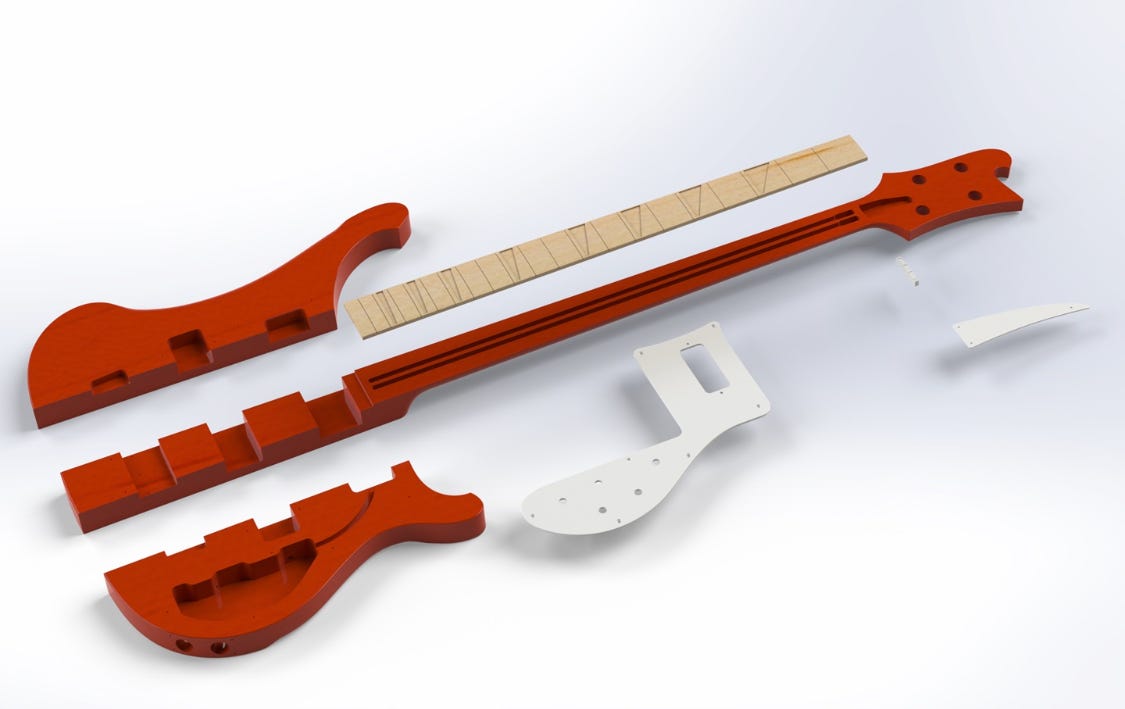 While it’s fairly clear from the picture above, here’s a 3D rendering of an “exploded” Rickenbacker neck-through bass to show you what all the components look like apart (although the routing is done after assembly):