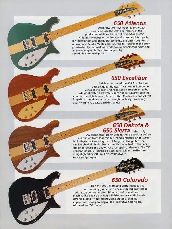 Back to the 650! Most of the modern 650 models—the Atlantis, the Dakota, the Excalibur/Frisco, and the Sierra—harkened back to those earliest neck-through models with natural necks and colored wings—even if it was simply differently colored woods. Only one—the Colorado—would follow the modern monochrome scheme.