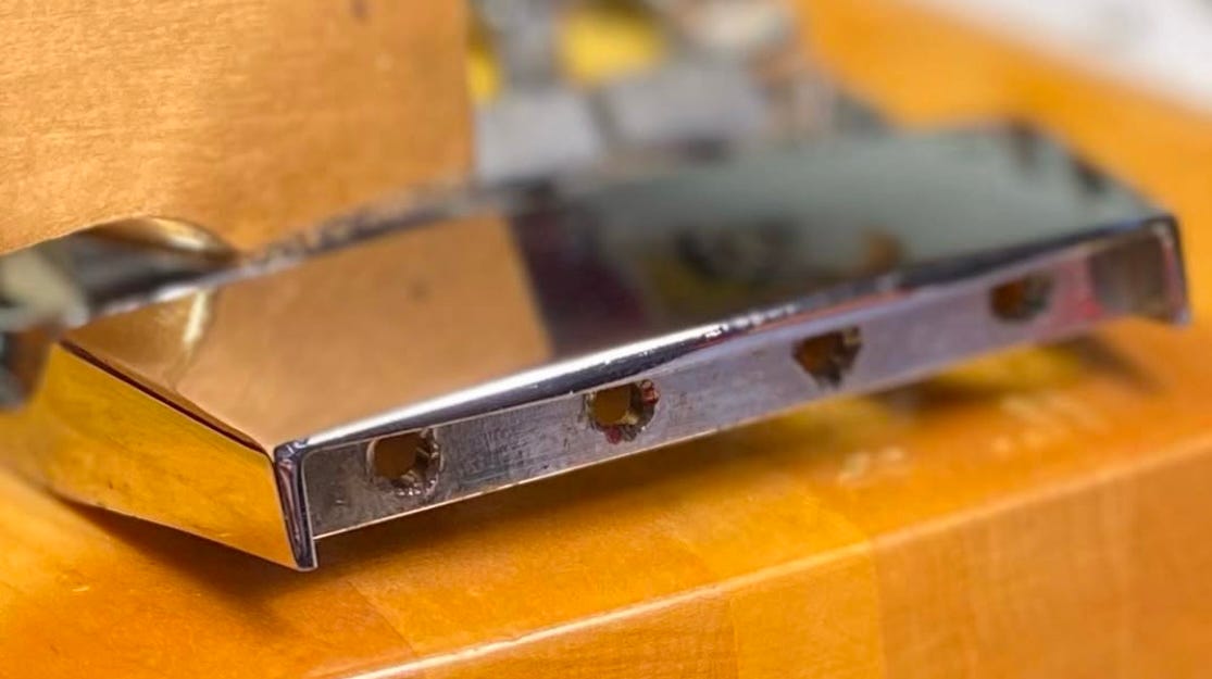 And Rickenbacker knew from the jump that the zinc base wasn’t going to be as strong as the aluminum one it replaced. How do we know that? We know that because they added two more screws—further back towards the end—to help hold it down.