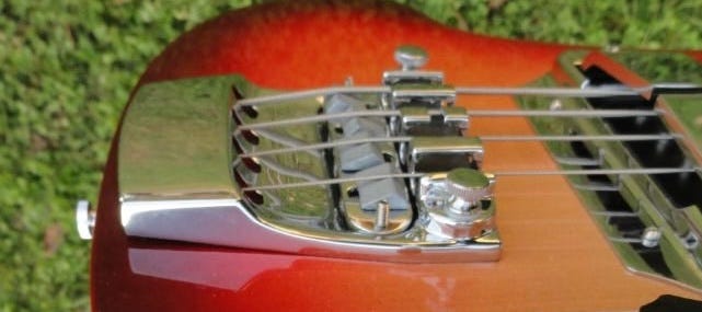 But finally in 1963–a full SIX YEARS after they started building bass guitars—Rickenbacker introduced a proper bass bridge. Consisting of a chrome plated sand-cast aluminum base with a built in adjustable mute and a drop-in bridge with adjustable saddles, it was actually a pretty elegant design.