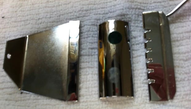 At the top we have the “string engaging saddle” with the handle attached. Bottom left is the tailpiece, and bottom right the spring. Both the “string engaging saddle” and tailpiece have a folded over lip that allows them to engage with the “attachment clips” on the spring. It all just interlocks and then is held in place by string tension.